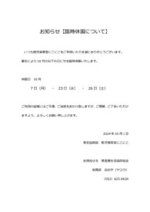 病児保育室にこにこ10月休園日のお知らせ